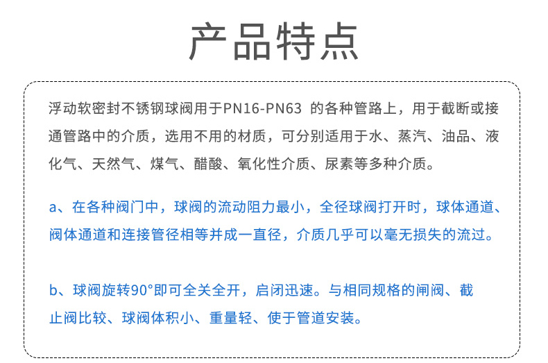 產(chǎn)品描述:手動(dòng)球閥、閥門(mén)、閘閥、水閥、控制閥、手動(dòng)閥,不銹鋼球閥用于PN16-PN63的各種管路上,用于截?cái)嗷蚪油ü苈分械慕橘|(zhì),選用不用的材質(zhì),可分別適用于水、蒸汽、油品、液化氣、天然氣、煤氣、醋酸、氧化性介質(zhì)、尿素等多種介質(zhì)。咨詢(xún)熱線(xiàn):400-185-1718