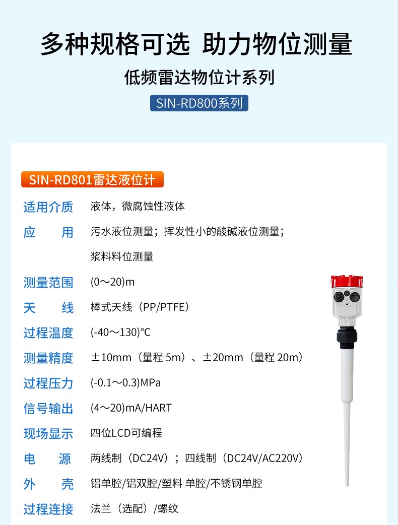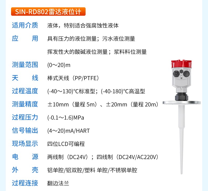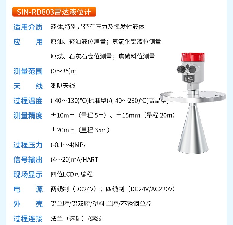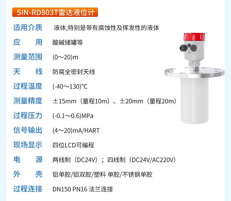 產品名稱:聯測_SIN-RD803T雷達物位計_適用于帶有腐蝕性及揮發性的液體