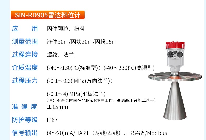 產品名稱:聯測_SIN-RD903雷達料位計_適用于固體料 結露