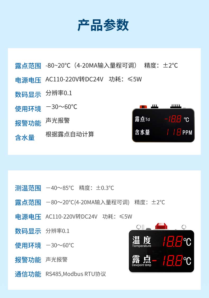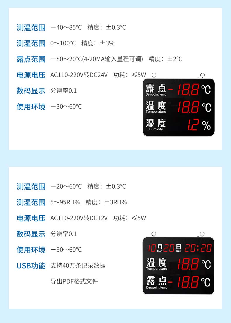 測量范圍 溫度:-40~85℃,濕度:0~100%,露點:-80℃~20℃(4-20mA量程可測)