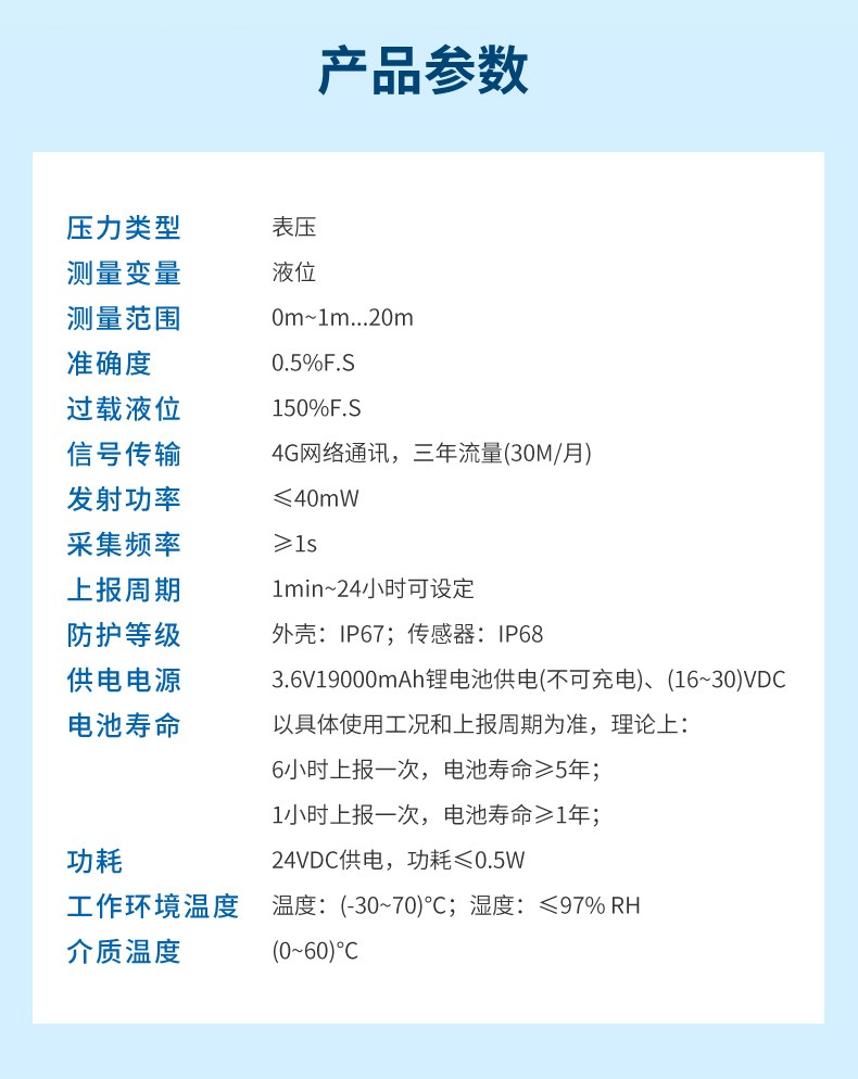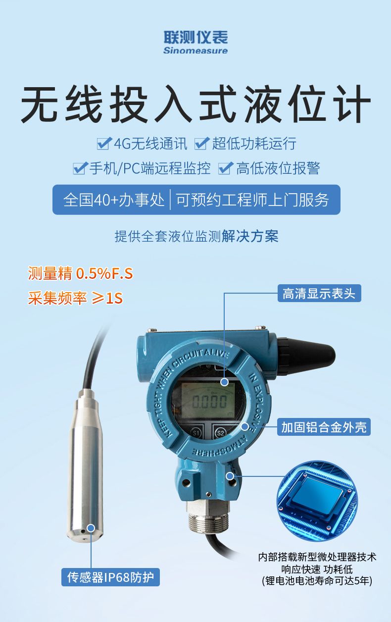 產(chǎn)品描述:無線投入式液位計是基于 4G 無線通訊網(wǎng)絡(luò)使液位的測量、變送、上報為一體的低功耗智能儀表。集成高靈敏度液位檢測元件,高精度信號調(diào)理電路,低功耗電池電源管理,豐富的 LCD 顯示界面于一體。周期性上報液位測量值、電池電量、信號質(zhì)量等數(shù)據(jù),并且能夠當液位超出設(shè)置范圍時及時報警,提前預(yù)警故障隱患。本產(chǎn)品適合油田、水利、消防管網(wǎng)、自來水管網(wǎng)、城市供熱管網(wǎng)等智慧城市應(yīng)用場景。